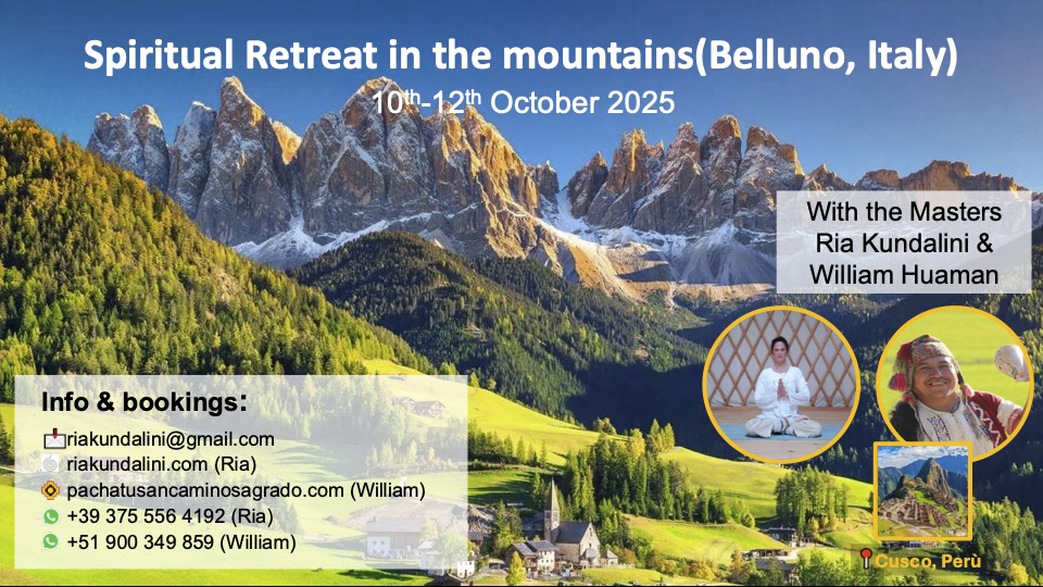 A retreat according to the school of spirituality of Kundalini Master Ria Kundalini and Andean Curanderism & Shamanic Master William Huaman Taype. An opportunity to heal the body and the soul and to do practices for the awakening of the self in the Natural Park of the Belluno Dolomites.